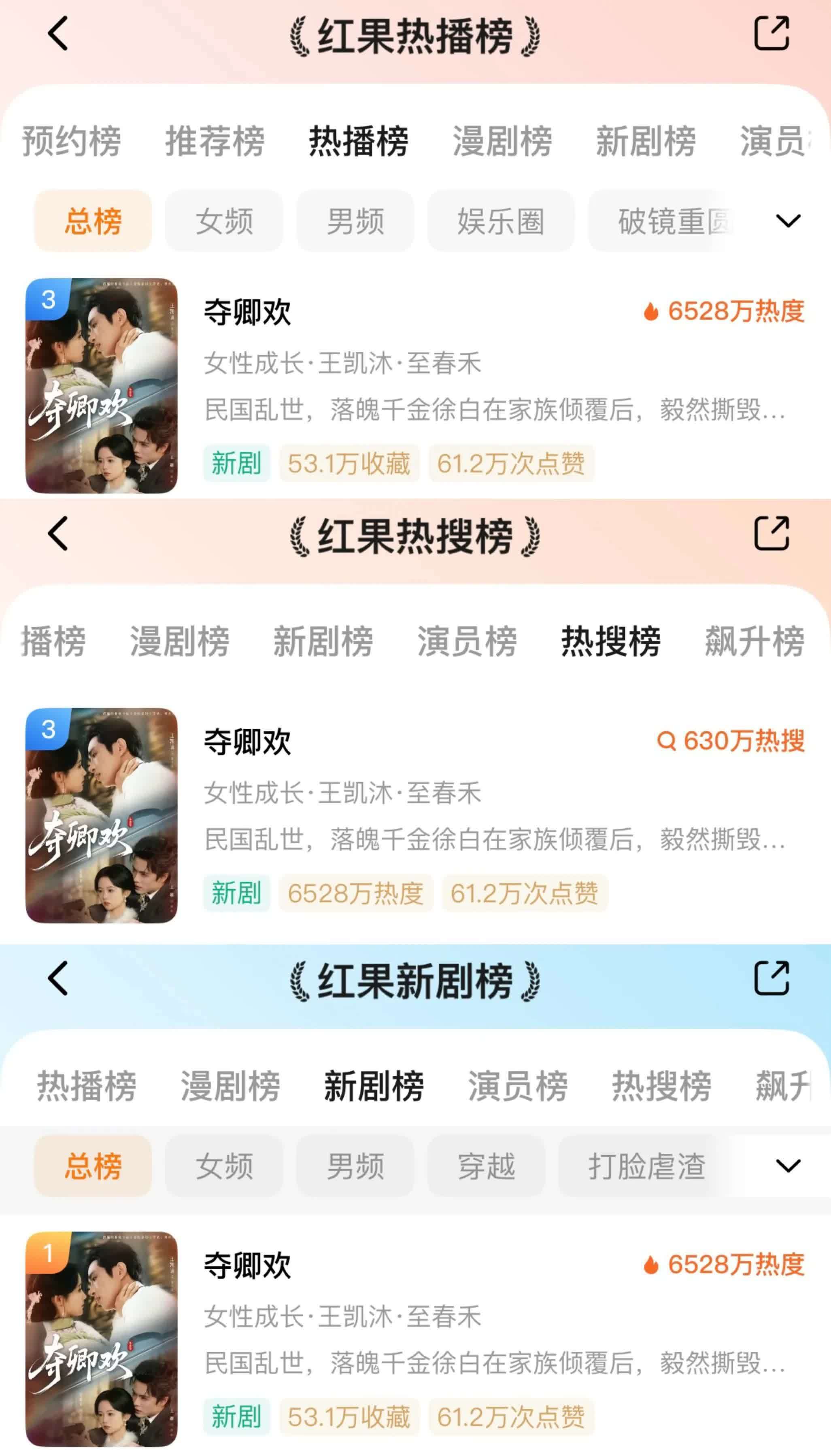 该剧昨日上线24小时,红果首日开播热度6528万,一举荣登红果热播榜和热搜榜两大榜单TOP3,同时也登顶了新剧榜TOP1