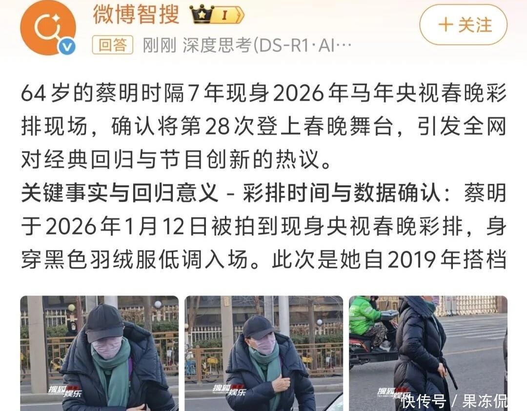 与此同时,64岁的蔡明穿着黑色羽绒服、围着绿色围巾现身,这是她时隔七年再次回归春晚舞台。然而消息一出,网络上却掀起了一阵抵制声浪。